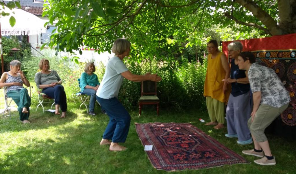 Und Claudia hat ganz offensichtlich tolerante Nachbar:innen, denn nun ließen wir sie heraus, einige der Figuren, Gestalten und Wesen, die in uns überwintert haben im letzten Jahr. Und dazu noch Kühe, verschreckte Mädchen und gewaltige Diven. Wir summten, sangen und ommten uns durch den Garten und näherten uns liebevoll unserer „Normalstimmlage“. Was Claudia und auch uns überrascht hat, war, wie schnell sich mit der Improvisation von Stimmen und Klängen auch gleich wieder Geschichten entwickelten!